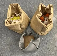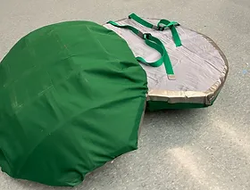 Middle: The two final shells that Karina & I laser-cut and the entire team duct-taped together, covered in cloth, and attached straps to.